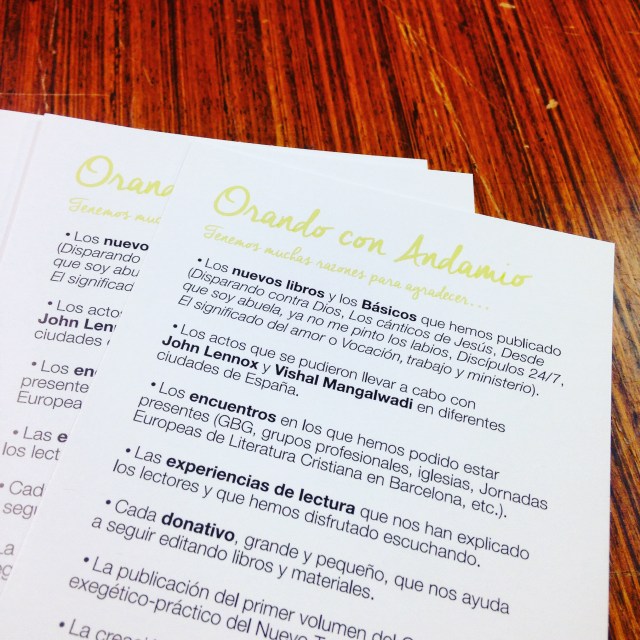 Cada jueves, en la oficina de GBU y Andamio, paramos puntualmente a las 12:00 de la mañana para hacer lo que más nos gusta. Nos apasiona hacer libros, nos entusiasma saber a todos los lugares y personas que llegan; pero nos encanta parar nuestro ritmo frenético para poner cada idea en las manos de Dios, […]